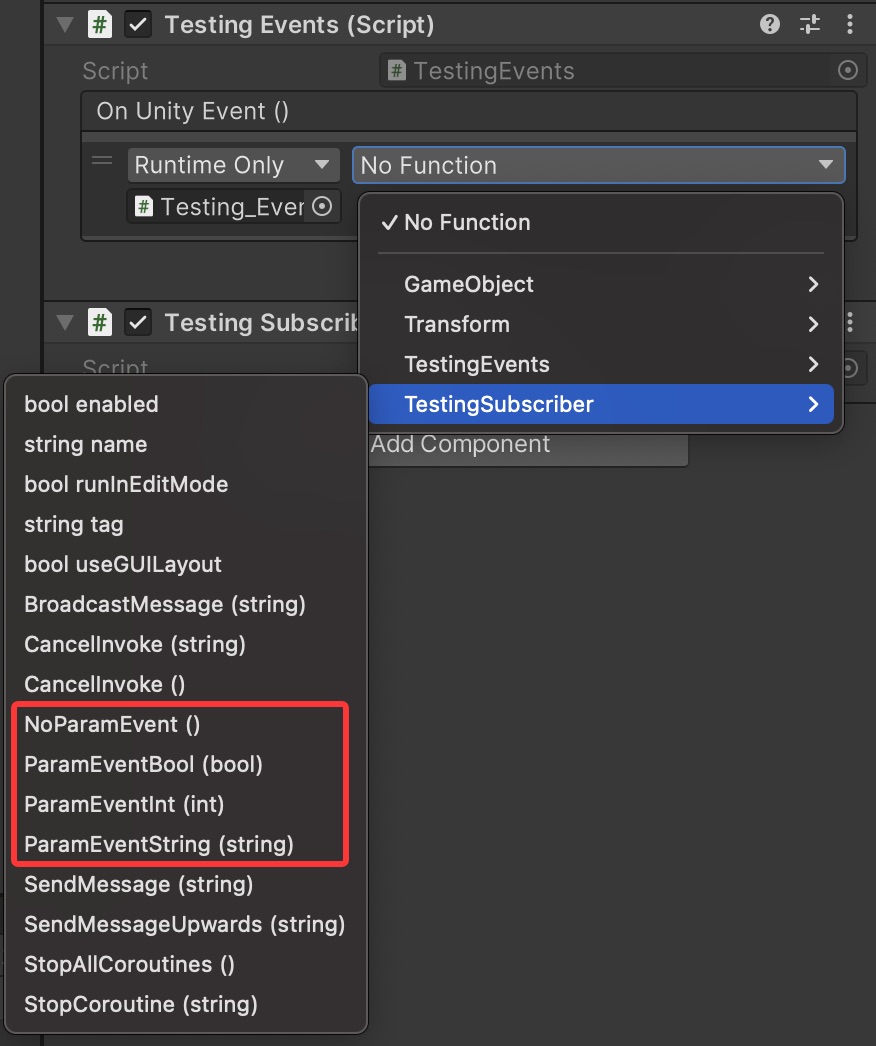 这就是 UnityEvent 的实用之处,现在我们在 TestingSubscriber 中写几个方法来供其使用: