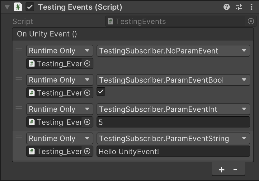 现在回到编辑器,点击 On Unity Event() 右下角的加号,手动添加一个订阅者,并将我们的 TestingSubscriber 拖到左下角的框内。