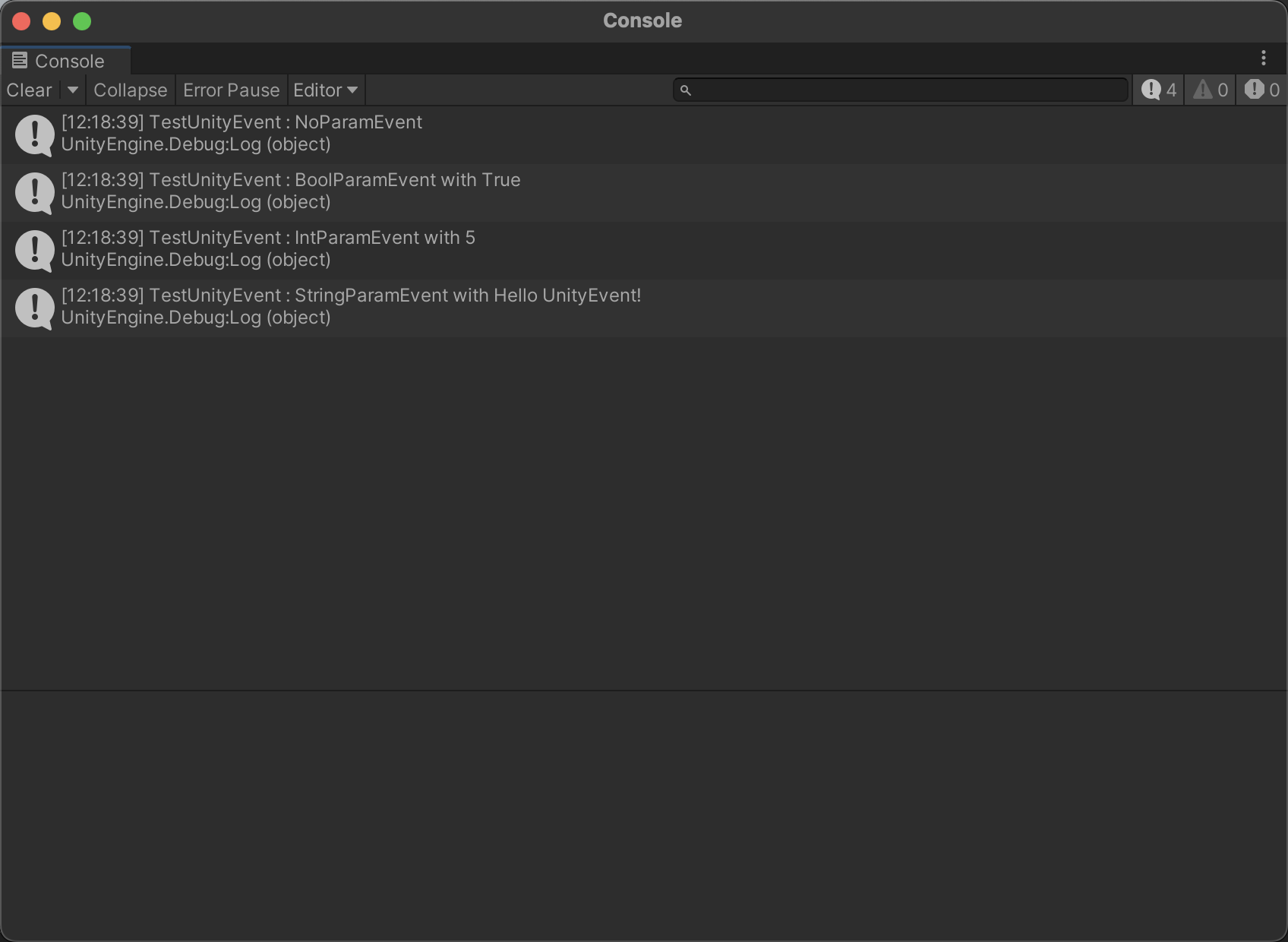 在上面的教程中,虽然我们一直在使用 Unity 进行测试,但实际上测试的 Event 事件均为 C# 的原生 Event。事实上,Unity 编辑器内部也集成有一个完整的事件系统,也就是 UnityEvent 类。